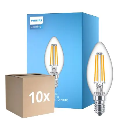 Confezione Multipack 10x Philips Corepro LED Candela E14 Filamento Chiara 6.5W 806lm - 827 Bianco Molto Caldo | Sostitutiva 60W