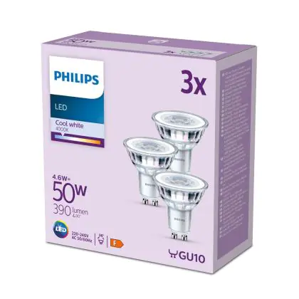 | Nome del fabbricante | Box 3 stuks - Philips LED Spot - 50 W - GU10 - Koelwit licht | |