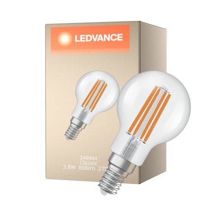 La lampada Ledvance Classic LED E14 Sferica Filamento Chiara 3.8W 806lm - 827 Bianco Molto Caldo | Sostitutiva 60W è il sostituto perfetto per le tue vecchie lampade 60W con attacco a vite piccolo E14 grazie alla sua tecnologia LED. Passare a LED ti offrirà molti vantaggi!