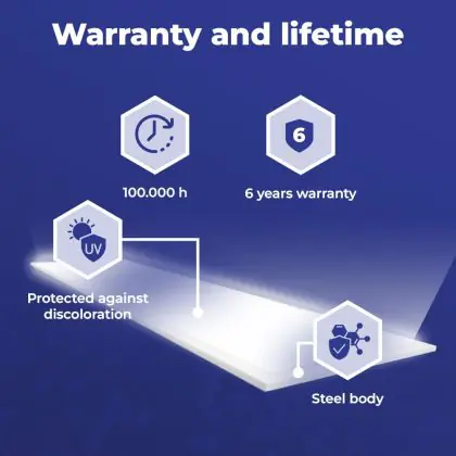 Questo pannello LED ha un ciclo di vita di 100000 ore, che vuol dire che funzionerà in modo ottimale per diversi anni. Questo ti permetterà di risparmiare sui costi di manutenzione e sostituzione! Inoltre, questo pannello LED è protetto da una garanzia di 6 anni. Infine, l'illuminazione LED permette di ridurre le emissioni di CO2 e, non contenendo sostanze tossiche, i LED possono essere riciclati.