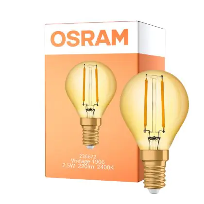 Descrizione Osram Vintage 1906 LED E14 Sferica Filamento Oro 2.5W 220lm - 824 Bianco Molto Caldo | Sostitutiva 25W